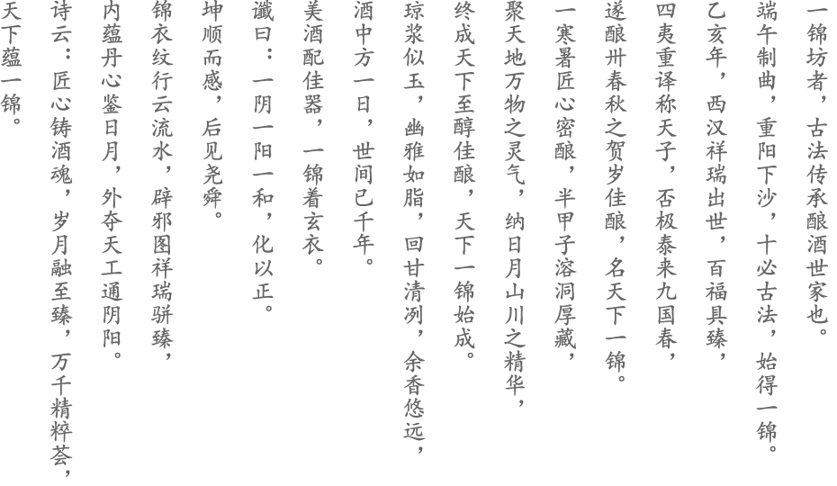 一錦坊誕生于赤水河畔茅臺鎮(zhèn)醬酒核心產(chǎn)區(qū),神奇、不可復(fù)制的天然釀酒環(huán)境孕育了一錦坊純厚靈動的品性,千年的釀酒歷史更鑄就其溫潤高貴、剛?cè)岵?jì)的靈魂。一錦坊傳承了茅臺鎮(zhèn)千年傳統(tǒng)釀酒工藝,又不斷改良創(chuàng)新,獨(dú)創(chuàng)“十必古法”219道密釀工藝,堅守品質(zhì)、恪守天時、順應(yīng)自然,天人合一釀造出一錦坊這世間正宗醬香美酒。
